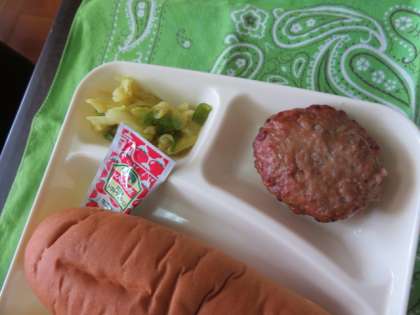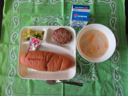 献立は、焼きハンバーグ、豆乳スープ、キャベツとピーマンのカレーソテー、黒糖パン、牛乳でした。
