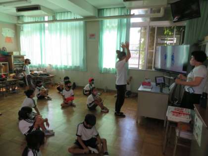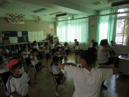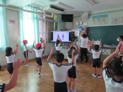 1・2組それぞれの教室で「足が速くなるダンス」の練習をしていました。