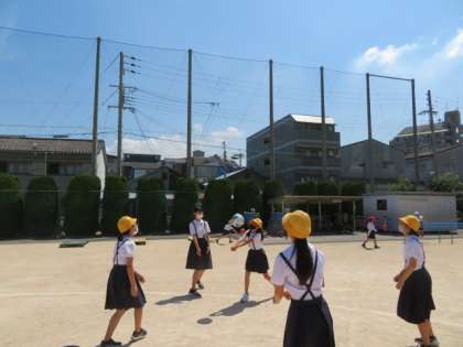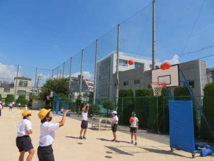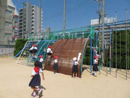 今日も天気が良く、子どもたちは広い運動場に広がって、それぞれの場所で運動遊びを楽しんでいました。