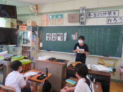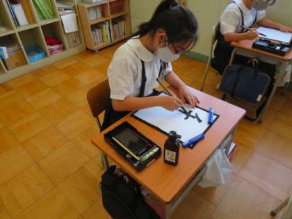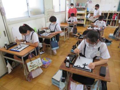「税に関する習字」の応募に向けて、各自で税に関する言葉を選んで書こうとしていました。