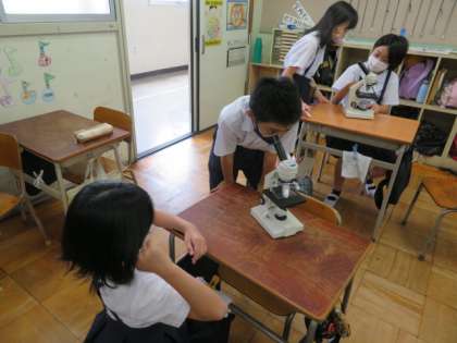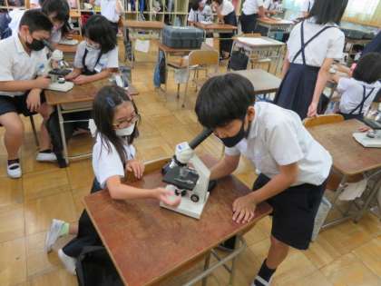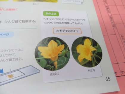 顕微鏡で、学習園で栽培していたオモチャカボチャの花粉を観察していました。