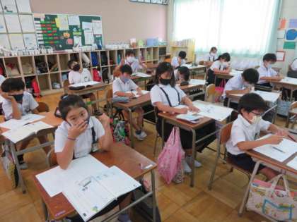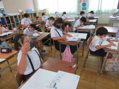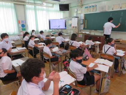 「学校についてしょうかいすることを考えよう」というめあてで、学校のことで紹介したい場所・人・行事などについて意見発表をしていました。