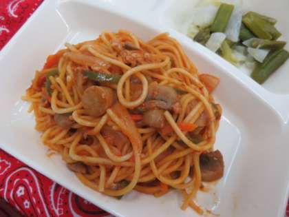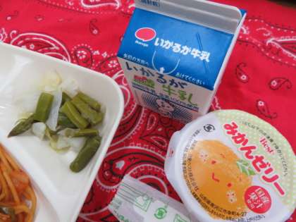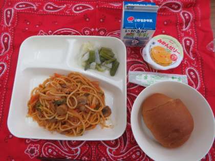 献立は、イタリアンスパゲッティ、グリーンアスパラガスとキャベツのサラダ、みかんゼリー、牛乳、1/2黒糖パンでした。
