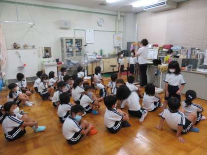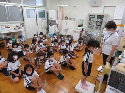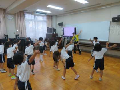 1年生は、この時間に1・2組が交互に発育測定・保健指導・足が速くなるダンスをしていました。