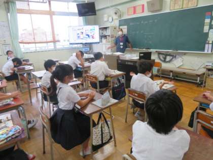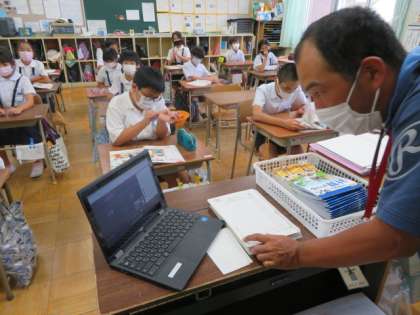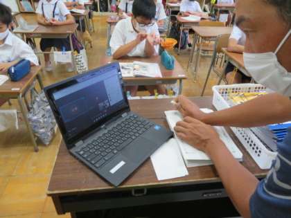 学校を休んでいる子どもと学習端末を使って、家庭とのリモートでやり取りしていました。