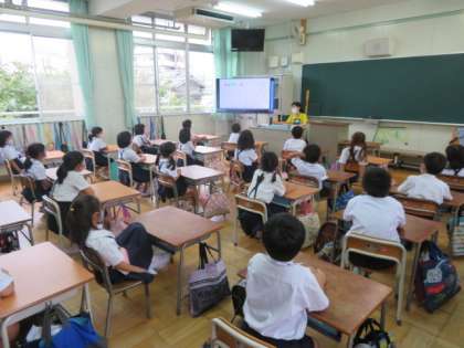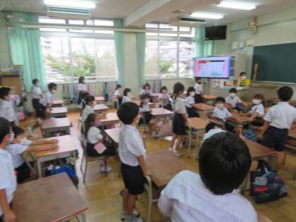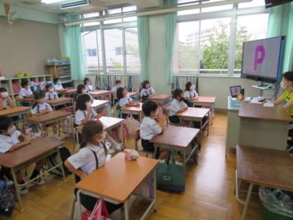 新型コロナウイルス感染拡大予防のために大きな声を出すことも、マスクをはずすこともできませんが、大型モニターから流れる音楽のリズムに合わせ、映像を観ながらしっかりとした控えめの声を出していました。