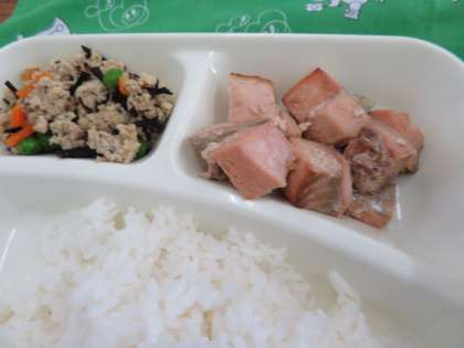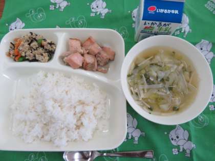 献立は、さけのしょう油風味焼き、五目汁、高野豆腐の炒り煮、ごはん、牛乳でした。
