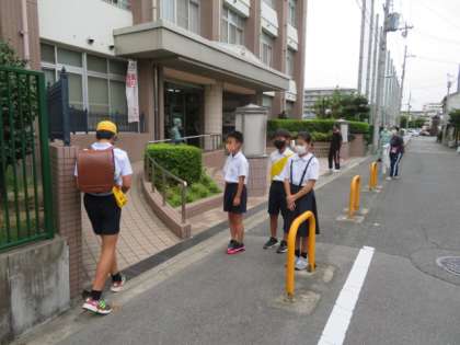 大きな声であいさつをかわすことはできませんが、登校してきた児童にしっかりとあいさつをしていました。