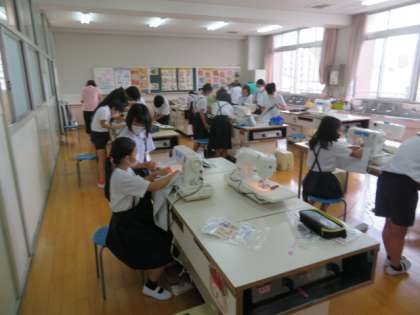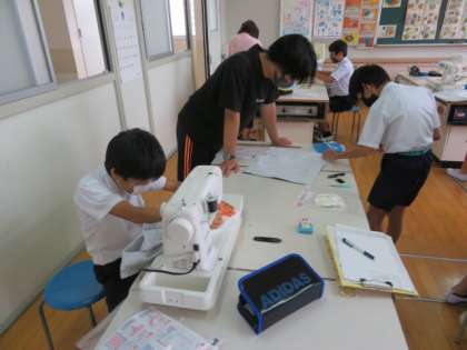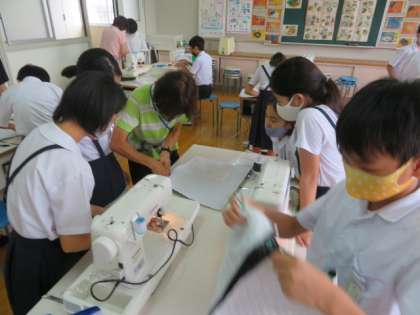 ナップサックを作ろうの学習で、カラーテープをはさみこんで両わきを縫うをめあてに実習を進めていました。