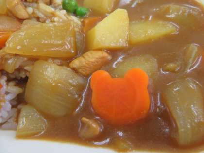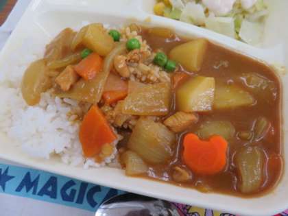 アレルギー対応の献立でしたが、チキンカレーライスにくまのラッキーにんじんが入っていたこともあり、いつものカレーライスと変わりなくとてもおいしくいただきました。