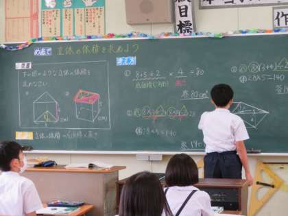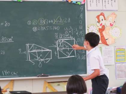 立体の体積を求めようというめあてで応用的な問題に取り組み、いろいろな考え方で体積を求めていました。