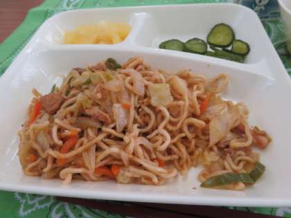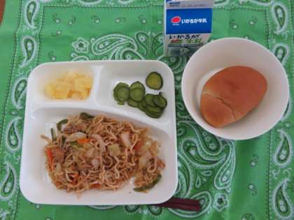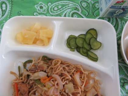 献立は、焼きそば、きゅうりのしょうが漬け、パインアップル(缶)、1/2黒糖パン、牛乳でした。