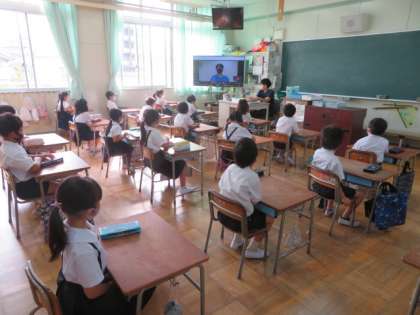学校では、児童朝会を先週に続いてGoogle Meetを使って、各教室に同時配信する形で行いました。