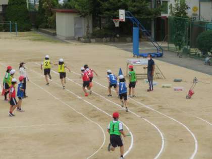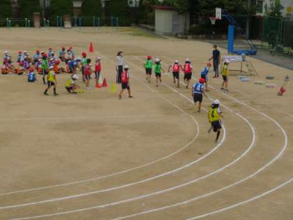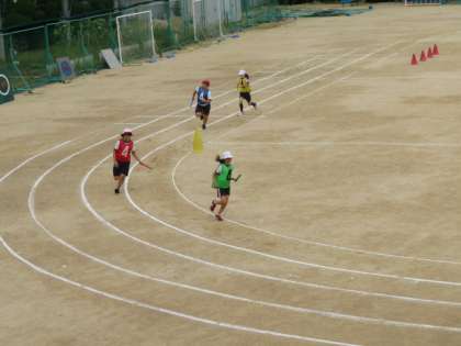 リレーのバトンパスの引継ぎを各チームごとに練習した後、運動会本番を想定したリレーを行いました。