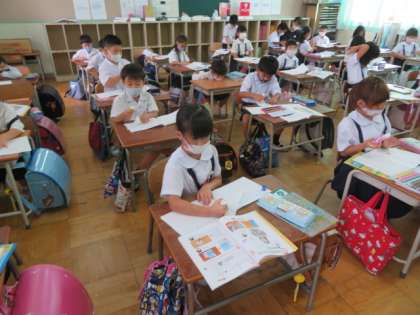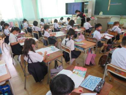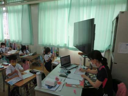 大型モニターを見ながら、四角い紙のたてと横の長さを、紙を折ることで比べていました。