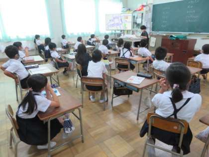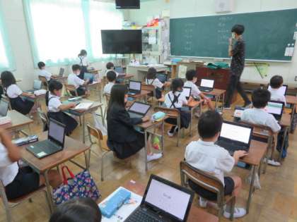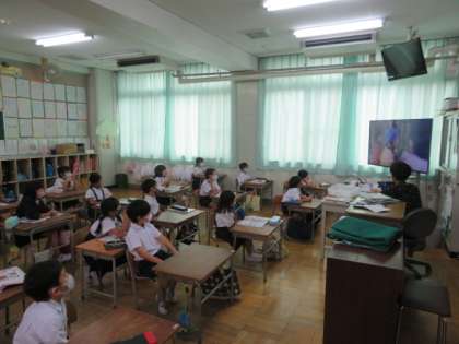 「まちのことを話そう」という学習で、大型モニターに映した資料映像や学習用個人端末を参考にしながら、柏里小学校区にどんなところがあるかということを発表したりしてわが町のことについて考えていました。