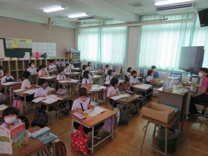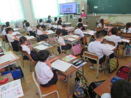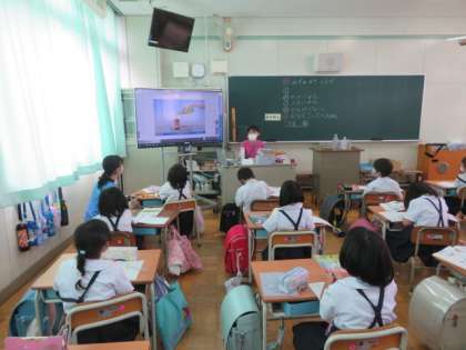 「みずのかさくらべ」で、違う容器に入っている水のかさについて大型モニターの映像資料を観ながら、みんなで考えていました。