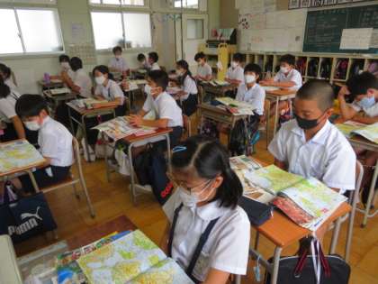 源平の合戦などについて、地図帳や資料を参考に調べていました。
