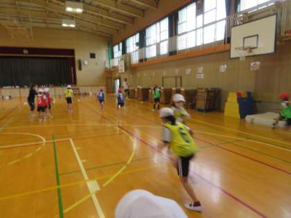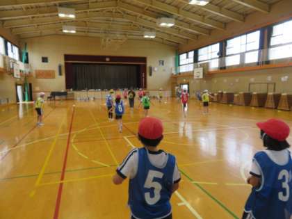 運動場の状態がまだよくないので、講堂でバトンの引継ぎの練習を重ねていました。