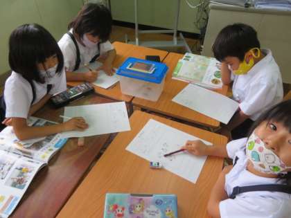 教室で以前からずっと飼育してきた「エンマコオロギ」を各グループごとに観察し、記録の用紙にエンマコオロギを描いたり、観察してわかったことを書いたりしていました。
