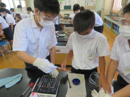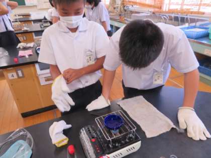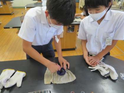 スチールウールを希塩酸の水溶液に入れ、反応が終わった水溶液を煮沸するとどうなるか確かめていました。
