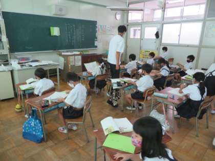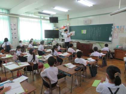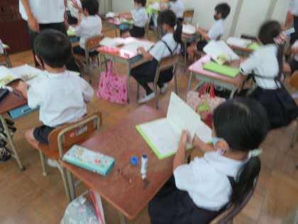 「ニャーゴ」の学習で、これまで自分の考えや意見を書いてきたワークシートを整理して、台紙に貼っていました。