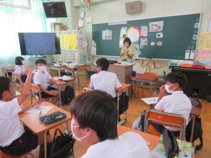 「一食分のこんだてをたてよう」で、栄養のバランスや食器のことも含めて考えていました。積極的に発表し、いろいろな意見を交流しながら、自分の考えを整理してまとめていました。