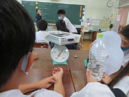 初めの実験は、1kgの水の入ったペットボトルと比べて1kgを予想して各グループで集めた物をはかりで確かめました。みんな100g以内の誤差でした。