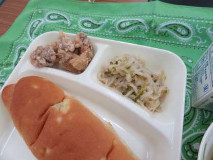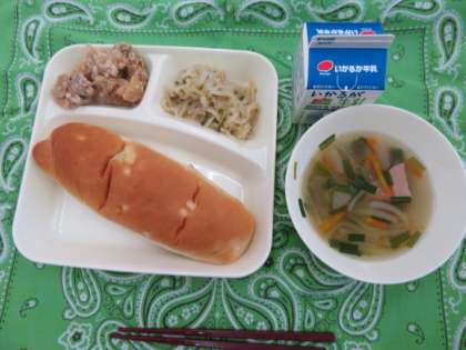 献立は、鶏肉のから揚げ、冬瓜の中華スープ、切り干し大根のごま辛味付け、おさつパン、牛乳でした。