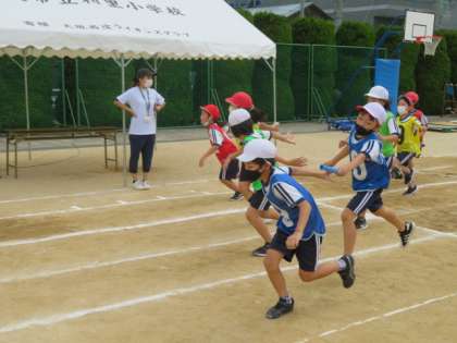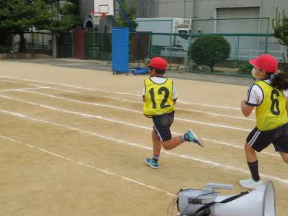 走り終えても、他チームの子どもと接触することなく、スムーズにバトンの引継ぎが行われています。