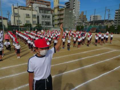 今朝は、全学年がそろって運動会の開会式の確認、練習を行いました。