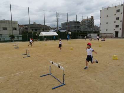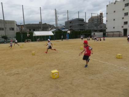 1・2年生の順に「かけっこ」を走り終えて、1年生の「マリオリレー」をしました。