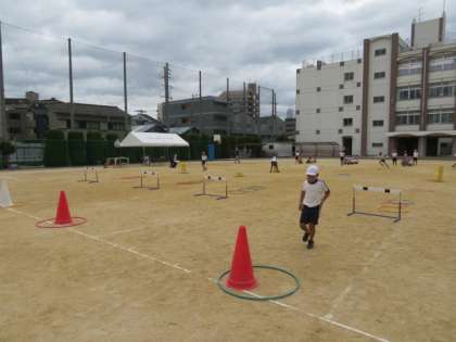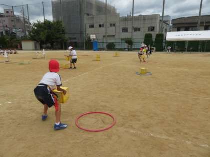 腰にバトン代わりのタグをつけて、障がい物折り返しリレーにチャレンジです。