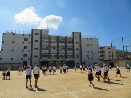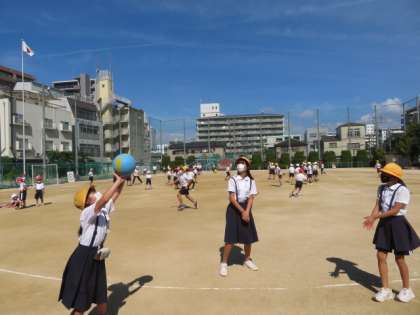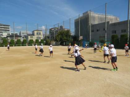 運動場に多くの児童が出てきて、運動遊びを楽しんでいます。