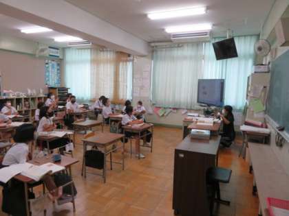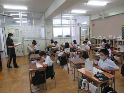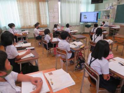 大型モニターにデジタル教科書を映したりしながら、教科書にある「竹取物語」や「平家物語」の名文を朗読していました。