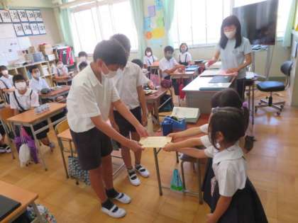 今日、1年生が昨日までに書いたお礼の手紙を6年生に届けることができました。