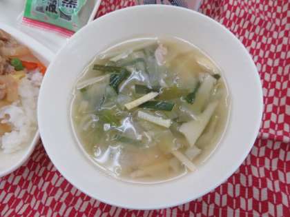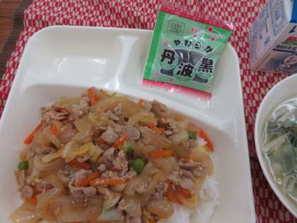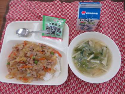 献立は、ピリ辛丼、中華スープ、ソフト黒豆、牛乳でした。