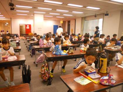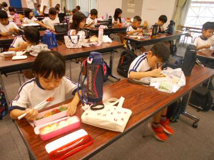キッズプラザで楽しんだあとは、最大の楽しみのお弁当です。学校と同様、密を避けて黙食で食べました。