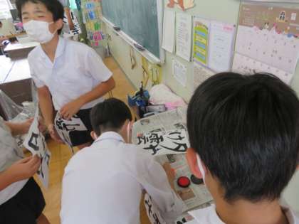 仕上がった半紙には自分の落款を押して、後ろの自分の書写作品の上に貼りました。