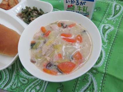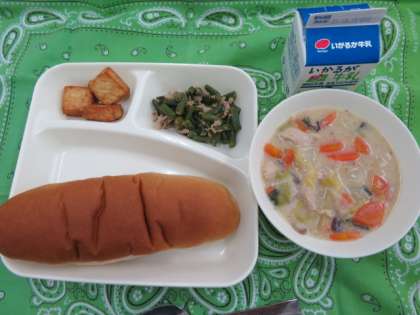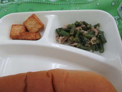 献立は、白菜のクリーム煮、厚揚げの胡麻醤油かけ、豚肉と三度豆のオイスターソースいため、黒糖パン、牛乳でした。