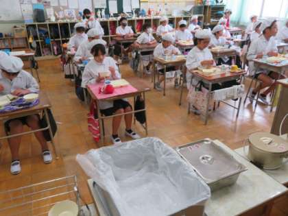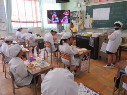 大型モニターの学習資料映像を視聴しながら、黙食・完食をみごとに果たしていました。