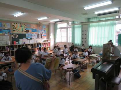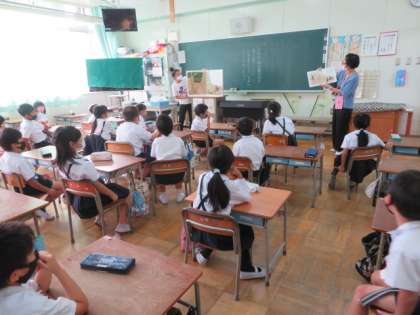 2年2組では、同じ絵本の大きなサイズの絵本も準備していただき、読み聞かせをボランティアの方2名でしていただいていました。
