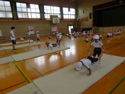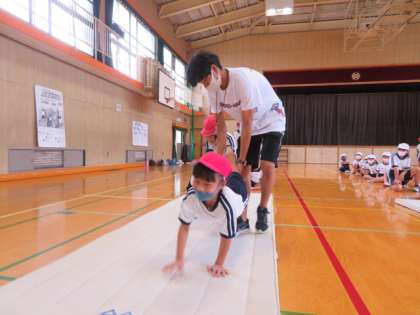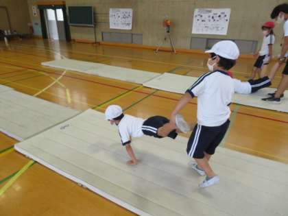 マット遊びで、いろいろな補助・補強運動にペアでチャレンジしていました。
