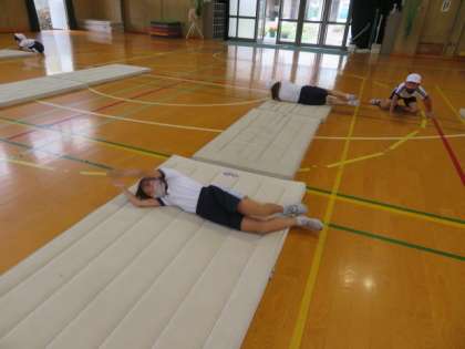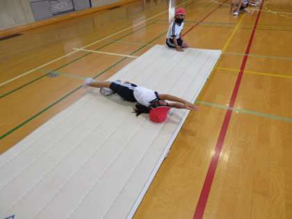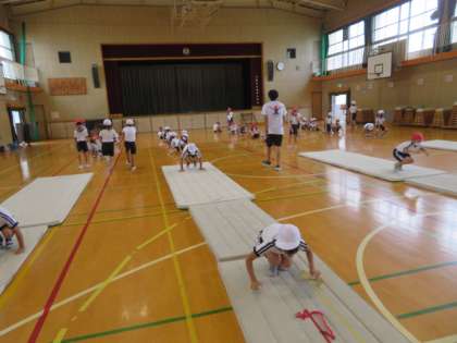 うさぎ跳びやゴロゴロ転がりなども手の着き方や姿勢に気をつけてチャレンジしていました。