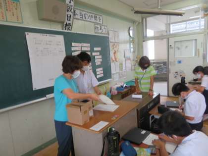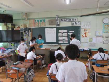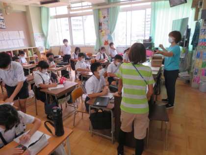 調理実習「たまご焼きにチャレンジ」ということで、家庭科室で調理実習についての手順の説明や注意から始まりました。