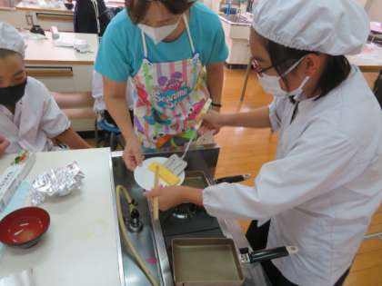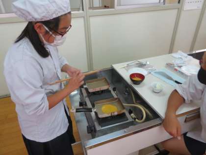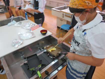各調理台で、一人ずつたまご焼きにチャレンジしています。