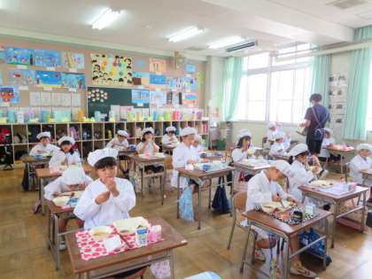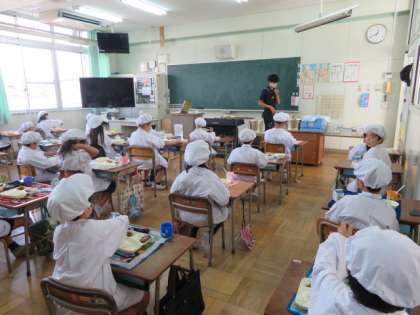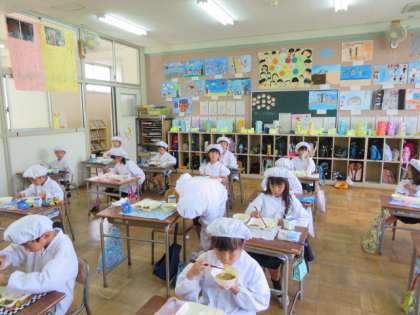 2年2組ではいただきますのあいさつのあと、さっとマスクをしまい、食べ始めました。