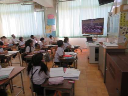 「パラリンピックが目指すもの」で、第三段落を要約することをめあてに大型モニターの映像も視聴しながら学習活動を展開していました。