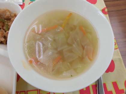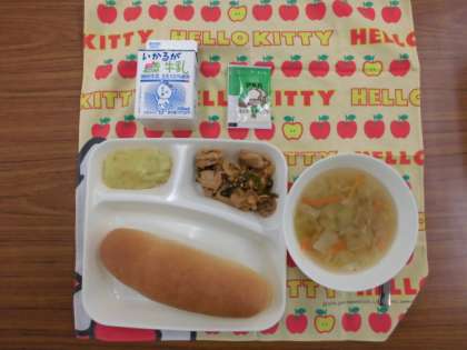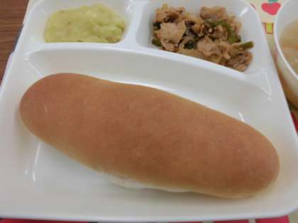 今日の献立は、コッペパン、牛乳、豚肉と野菜のケチャップソテー、スープ、スイートポテト、ソフトマーガリンです。