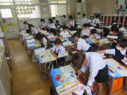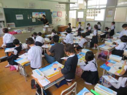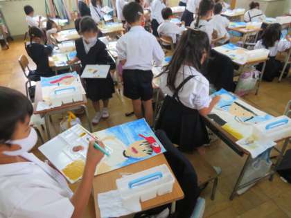 パスで描いた運動会の絵の背景を水彩絵の具で彩色していました。